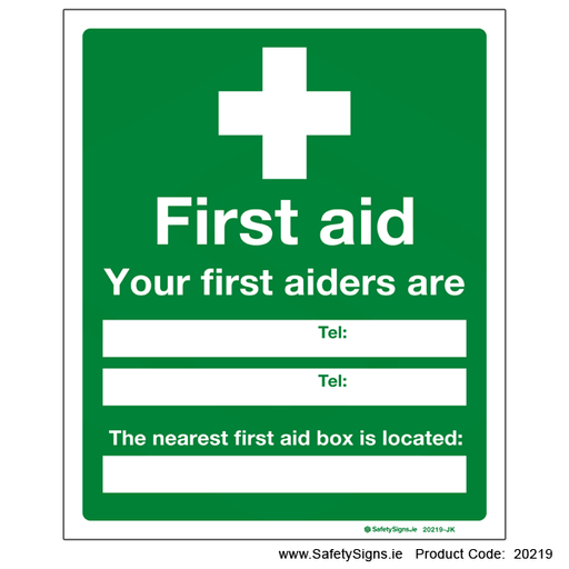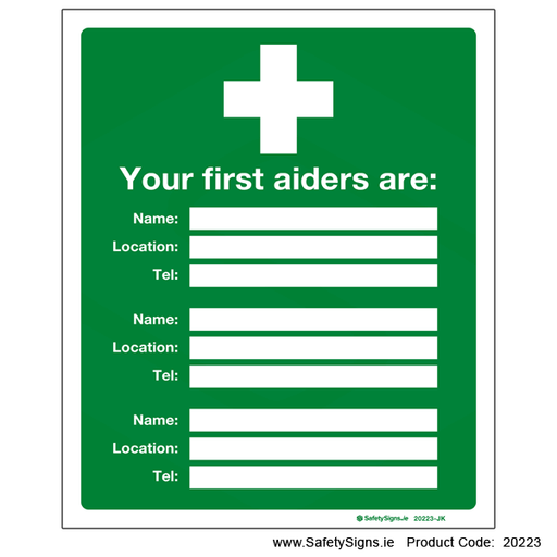 First Aiders - 20219Original price €3.90 - Original price €39.65Original price€3.90 - €39.65€3.90 - €39.65Current price €3.90| /This sign is used to indicate the names and contact numbers of trained personnel as well as the location of equipment to use it in the event of an ... View full detailsOriginal price €3.90 - Original price €39.65Original price€3.90 - €39.65€3.90 - €39.65Current price €3.90| /