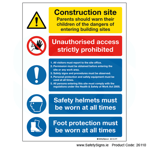 Construction Site Safety Notice Boards deliver multiple messages from one sign warning of hazards on building sites and providing instructions for PPE (Personal Protection Equipment) requirements for compliance with health and safety regulations. All our Site Notices are available in various materials, sizes and configurations depending on the site activity.